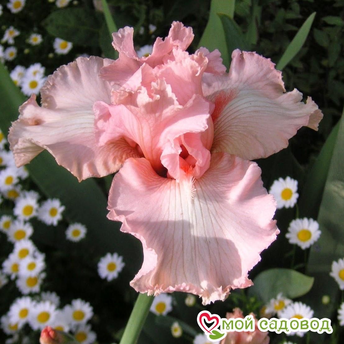 Ирис Парадайз формирует потрясающие цветки, напоминающие пачку балерины. Лепестки окрашены в нежно-розовый цвет. По краям они гофрированные и слегка скрученные. Нижние лепестки у основания с ворсистой полоской. Аромат приятный, едва уловимый.